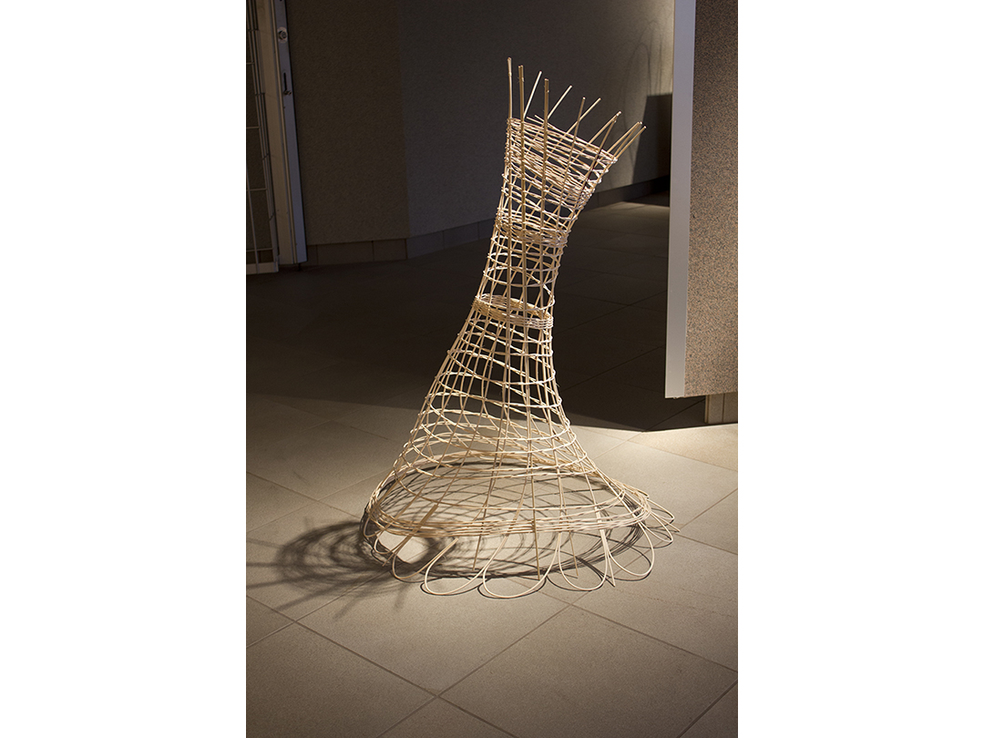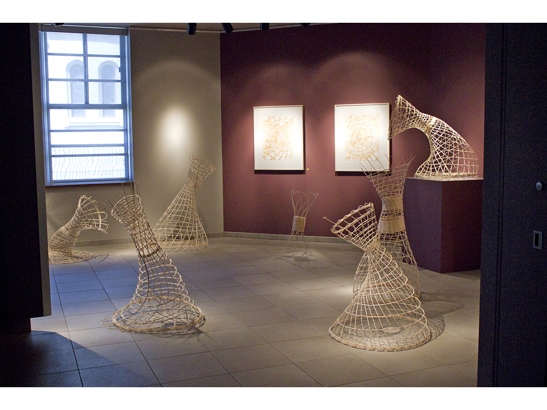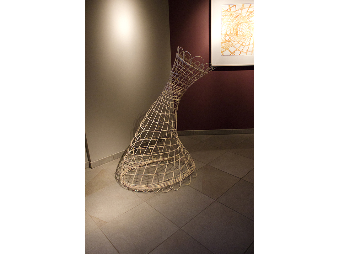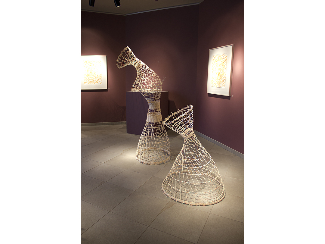 Woven rattan reed forms with acrylic ink drawings.