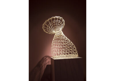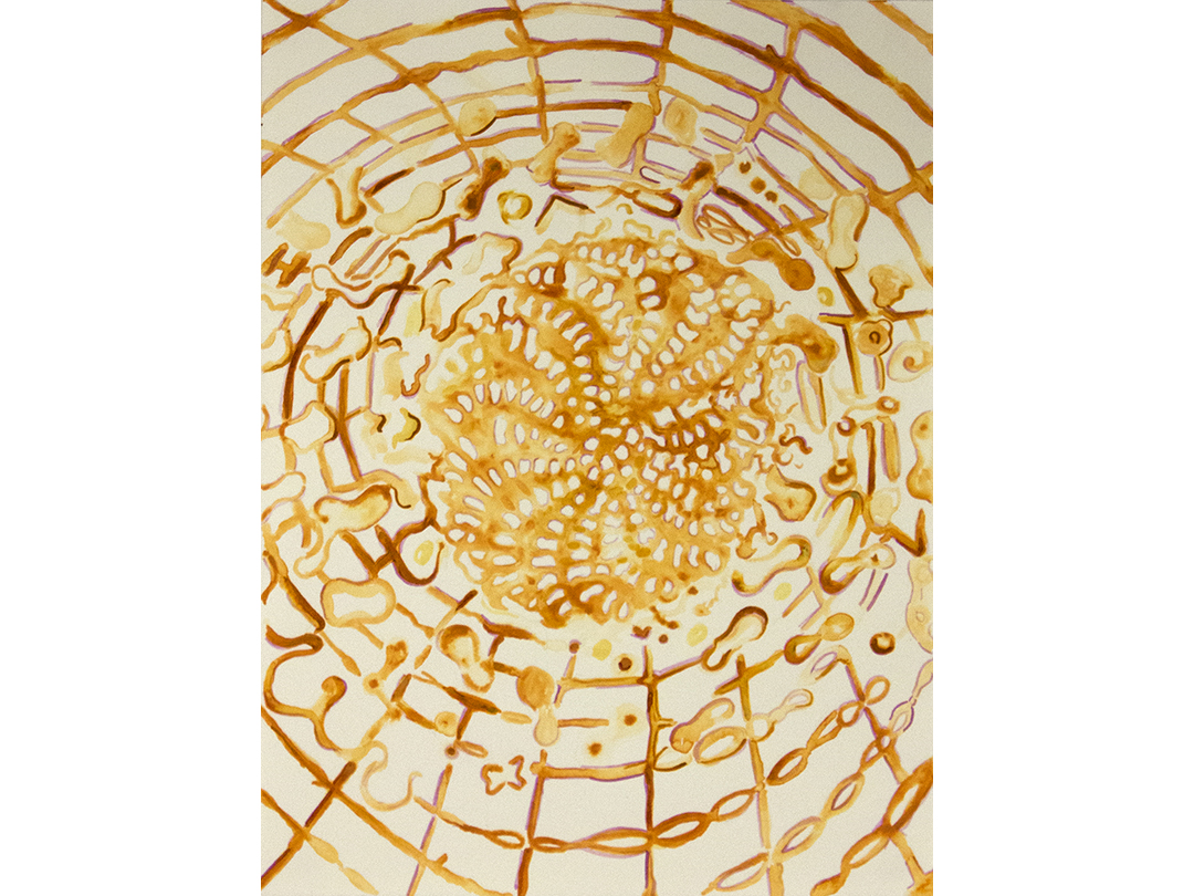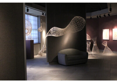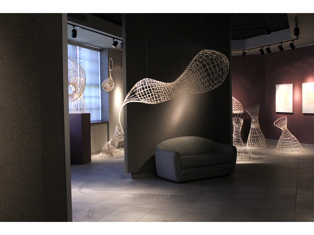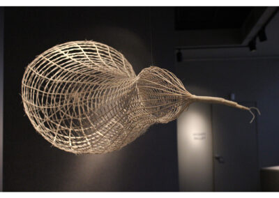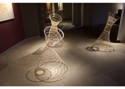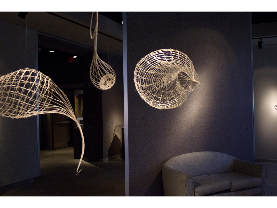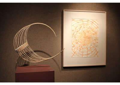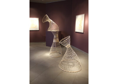Woven rattan reed forms with acrylic ink drawings.